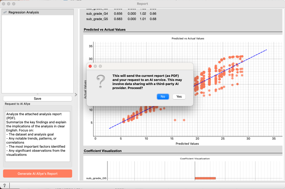 AI Reporting: Let the AI draft a report interpreting the results. If a Regression Analysis output feels hard to articulate, instruct the AI to write the report. Adjust the "Request to AI Allye" prompt whenever you need emphasis on a specific point.