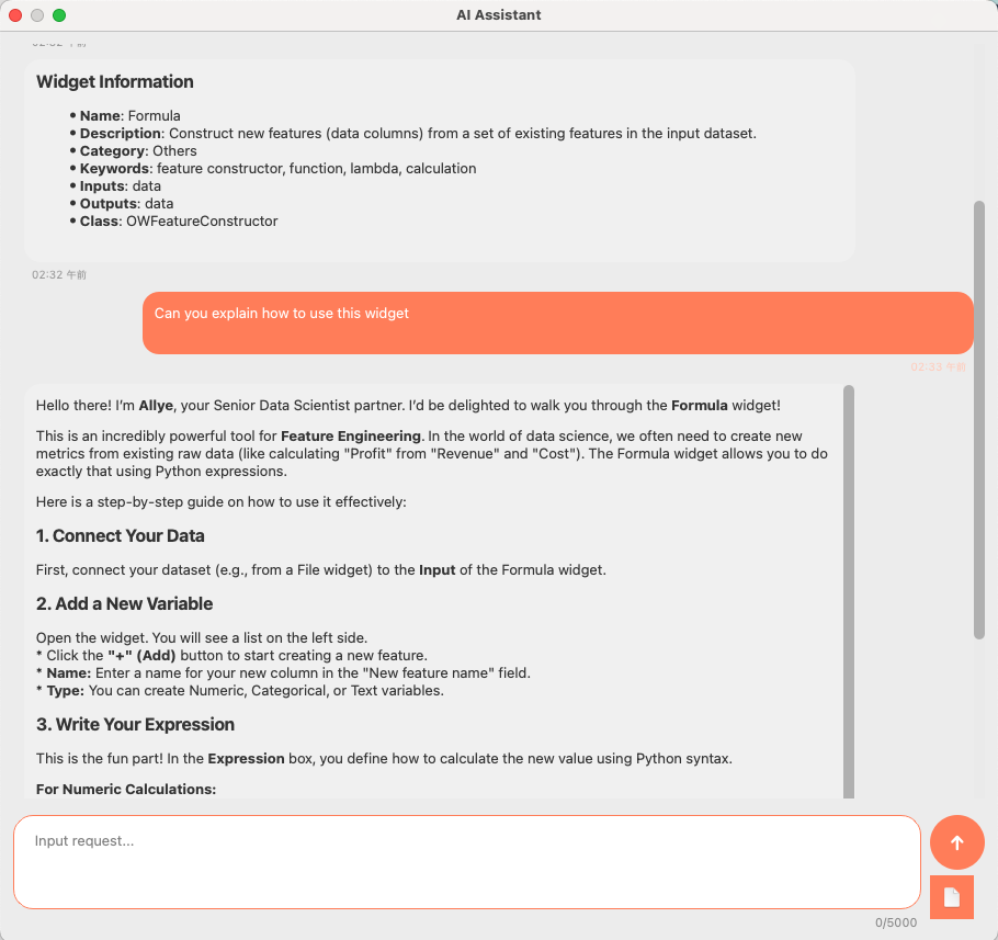 Ask: Use this to consult the AI about how the widget works or its detailed specifications. For example, if you are unsure how to use theFormulawidget for light data wrangling, ask here.