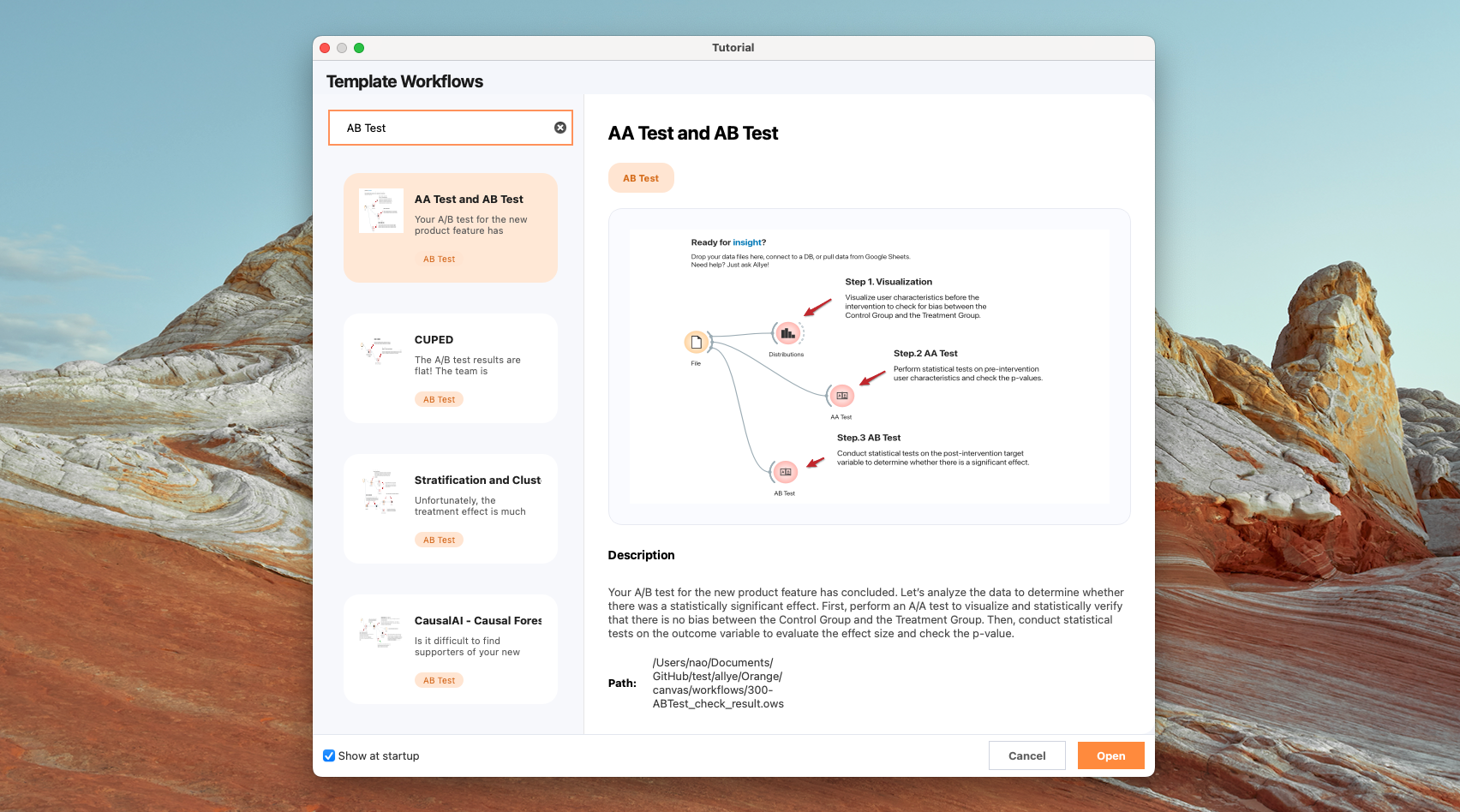 File → AB Testand set it to an AA Test (test type = Auto/AA). Select several pre-period metrics as targets. Review:- Effect size (should be near zero if randomized well).