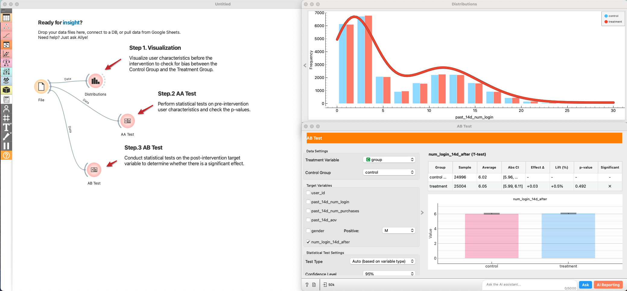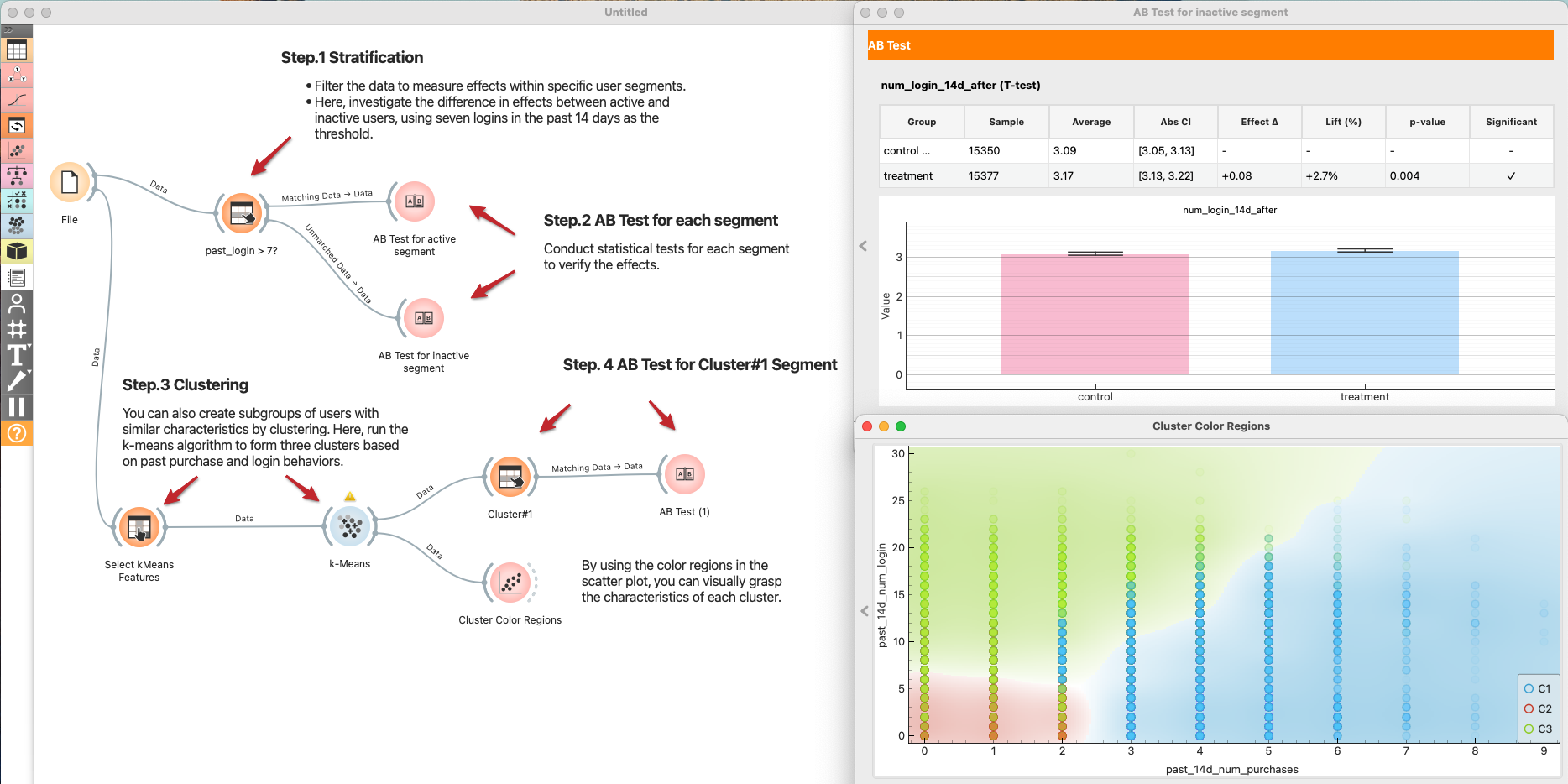 File → Select Columnsto choose clustering features (e.g., past logins, purchases).Select Columns → k-Means(k=3 as a start; normalize features).k-Means → Scatter Plotto color users by cluster and understand their profiles.k-Means → Select Rows (Cluster#1) → AB Testto estimate effects per cluster. Repeat for other clusters.- Summarize which clusters respond positively and which do not.