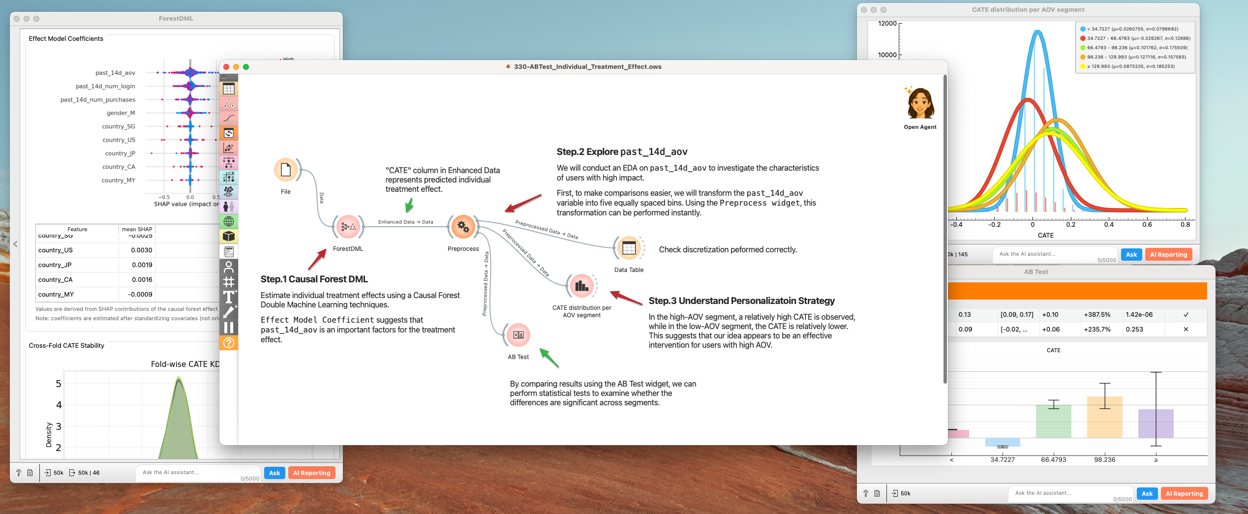 File → Forest DML.Causal Forest Double Machine Learningis designed to robustly estimate Conditional Average Treatment Effects (CATE) by combining orthogonalization with a causal forest for heterogeneous treatment effect modeling. -- Susan Athey "Generalized Random Forests" (2019) - Inspect: