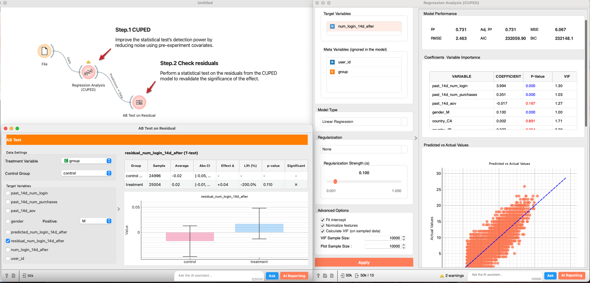 Features, select pre-experiment covariates (e.g., past 14d logins/purchases). Set the post-period outcome as the target. Regularization: None (for a plain CUPED baseline), or add if you have many covariates. - From the regression output, send Predictions → AB Test.